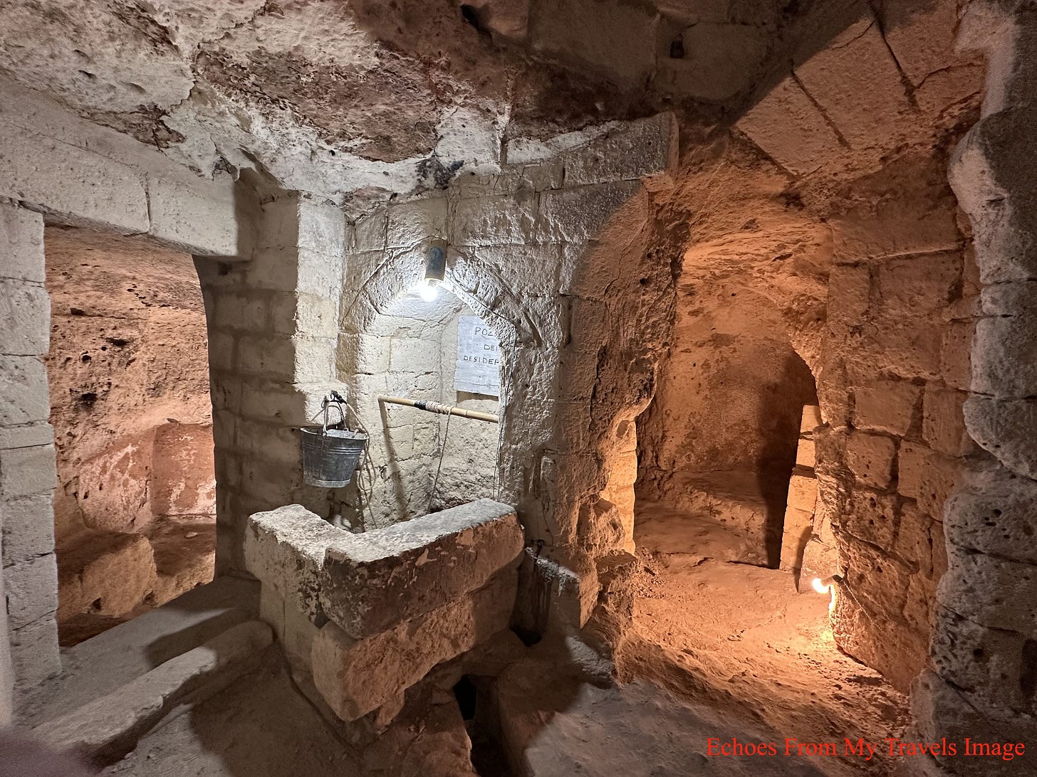 我離開了餐廳,走進一洞穴石室,洞穴裡有水井,看到早期居民如何在小小空間盥洗烹煮與清洗。在入口破碎的牆上,還掛著十字架,好似等候基督的降臨,帶領他們走到奶蜜之地。
