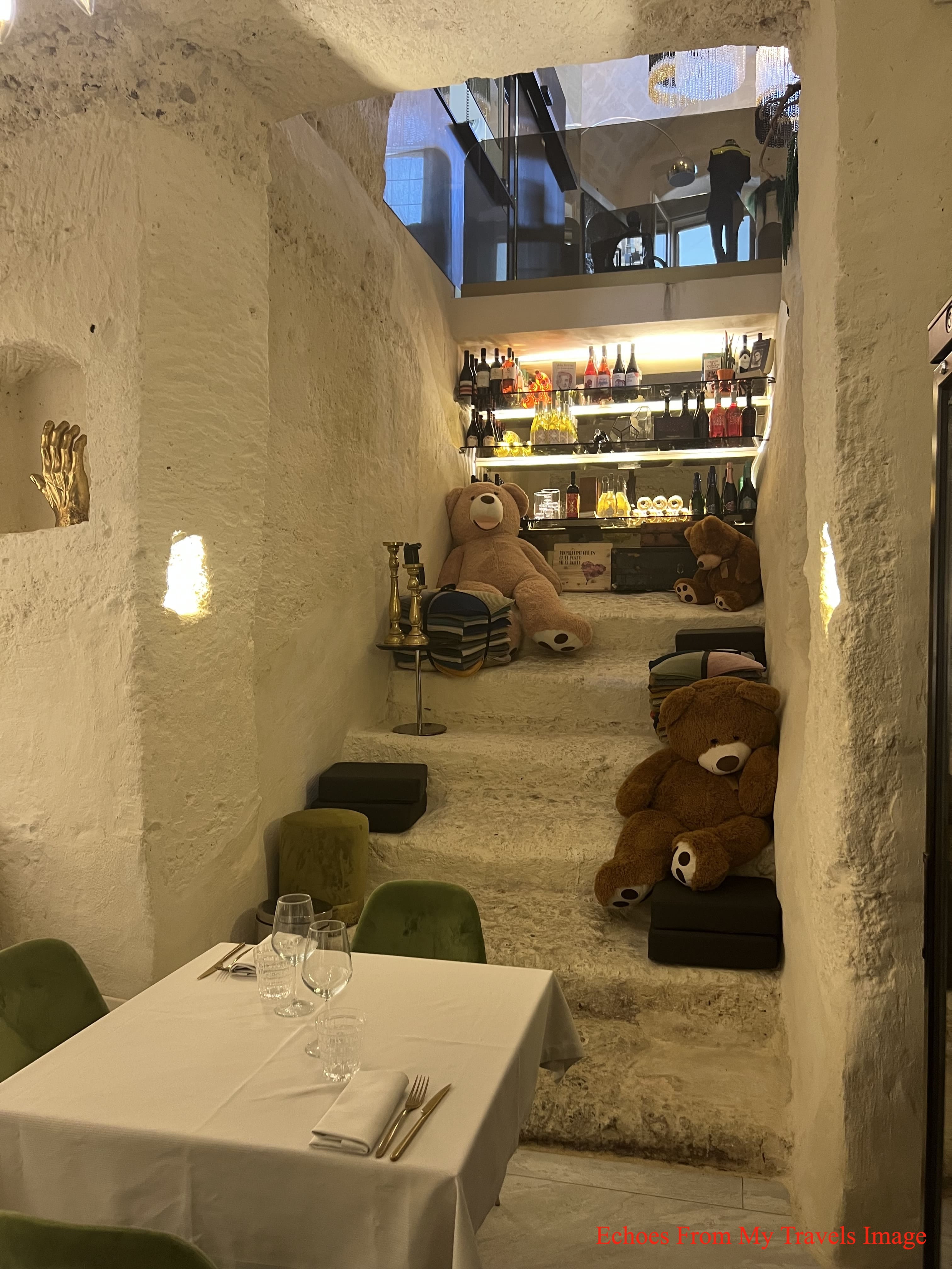 餐廳以老祖母茱莉亞命名,內外裝飾展現精緻藝術之美,在石窟裡,層層往下的地洞用餐區,在精心設計的燈光下,烘托出溫馨氣氛。餐廳門口幾座雕像,充滿現代藝術意境,從這餐廳的再生可以知道馬泰拉的薩西城區被列爲世界文化遺產,其實也在讚揚對城市與心靈文化重建的貢獻。
