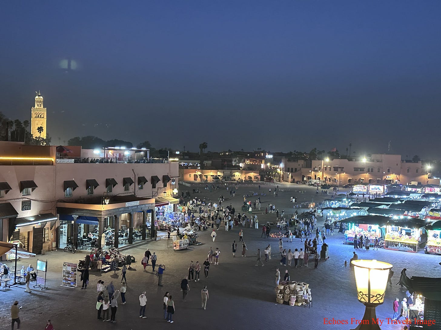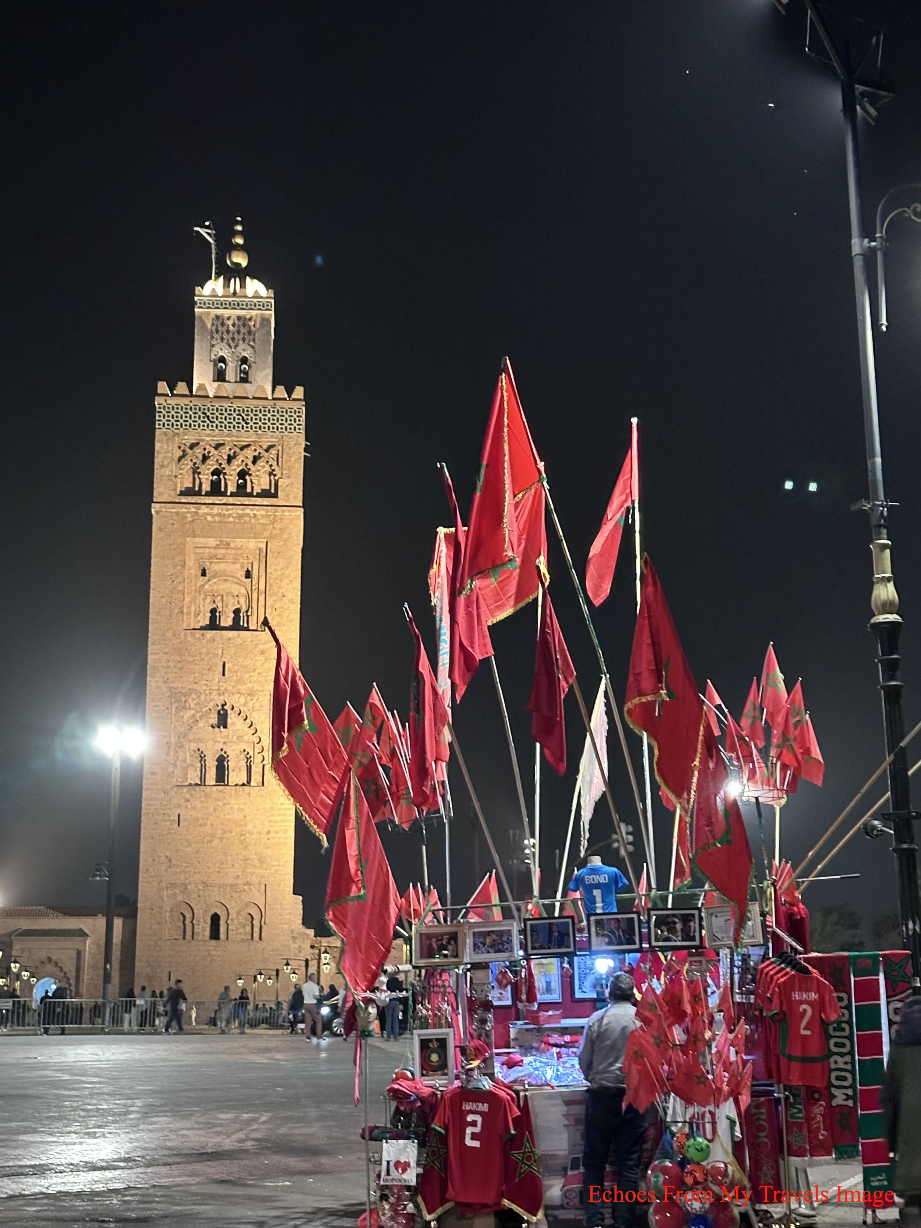 那景象如畫:遠山為幕,塔樓與廣場為景,寧靜中透著熱鬧。廣場上,有舞蛇人與耍猴藝人,也有販賣飲食與紀念品的攤位,熱鬧非凡。晚餐後,我們在廣場閒逛,坐在一張小板凳上,點了杯薄荷茶。小販叫賣聲、板車鈴響與吹笛聲,伴隨烤羊肉的香氣。據說,廣場一隅還有說書人講述古老傳說。那一刻,馬拉喀什的魅力在這多重氛圍交織中躍然眼前。