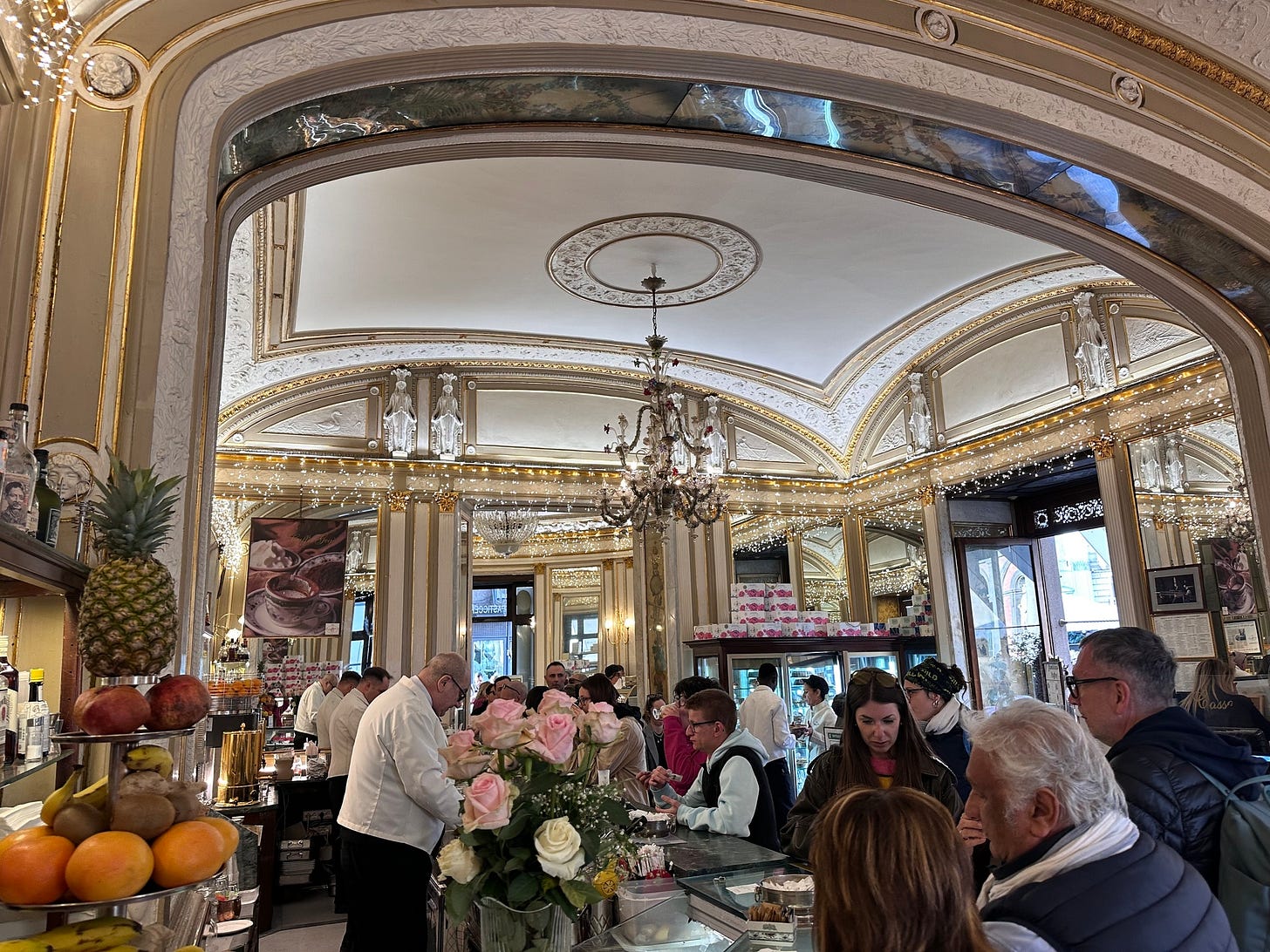 茜茜公主是我喜歡的歷史人物,這位傳奇人物曾在此品嚐紫羅蘭冰淇淋,我坐在大廳靠落地窗邊,看到拿波里皇宮前廣場的熱鬧景像,那一刻想到百年前,這位熱愛旅遊的茜茜公主,是否也坐在這同一大廳,寫下她的旅行詩歌:「 大地上沒有一個角落,可以讓我築起永久的巢穴」。