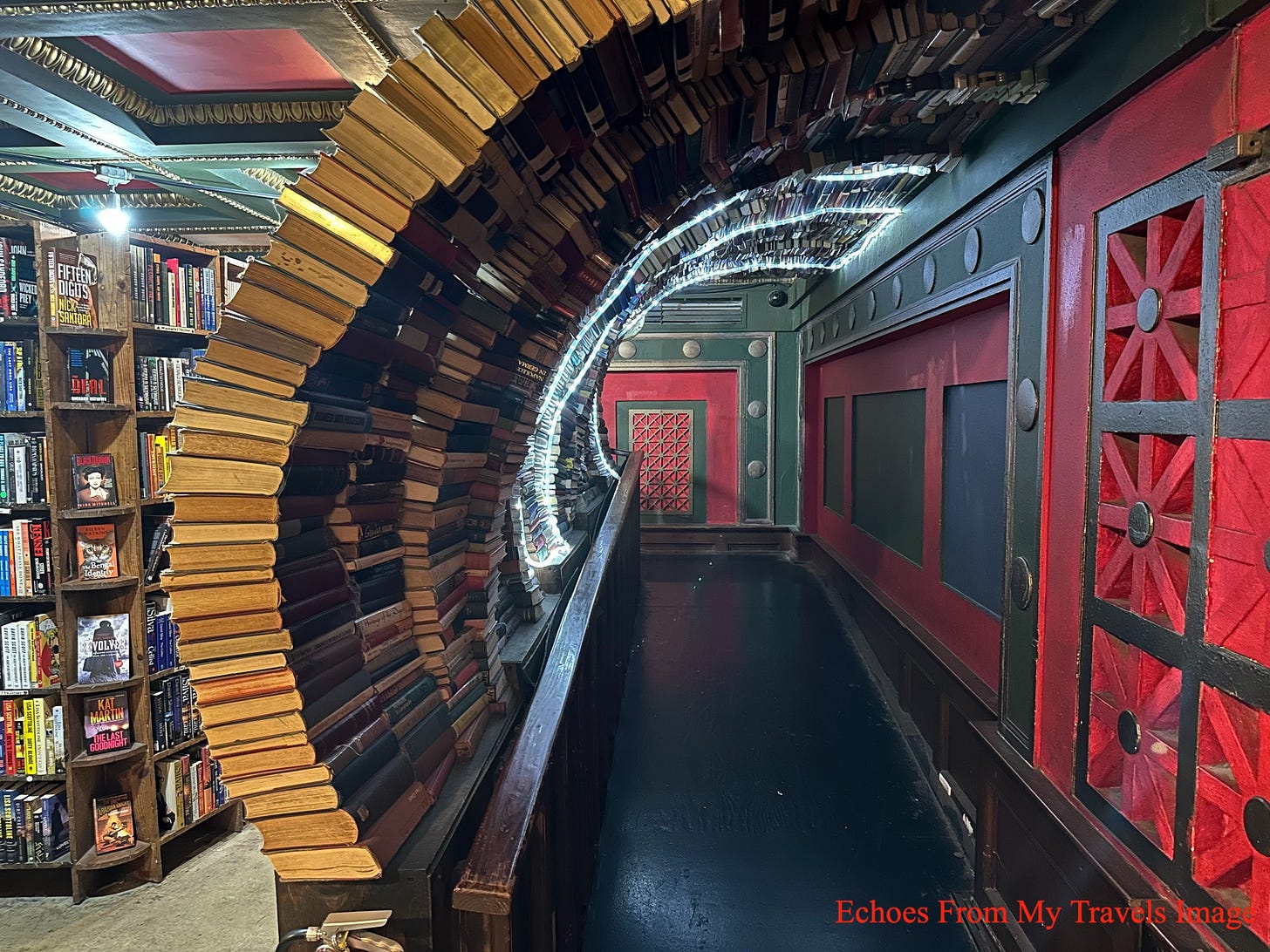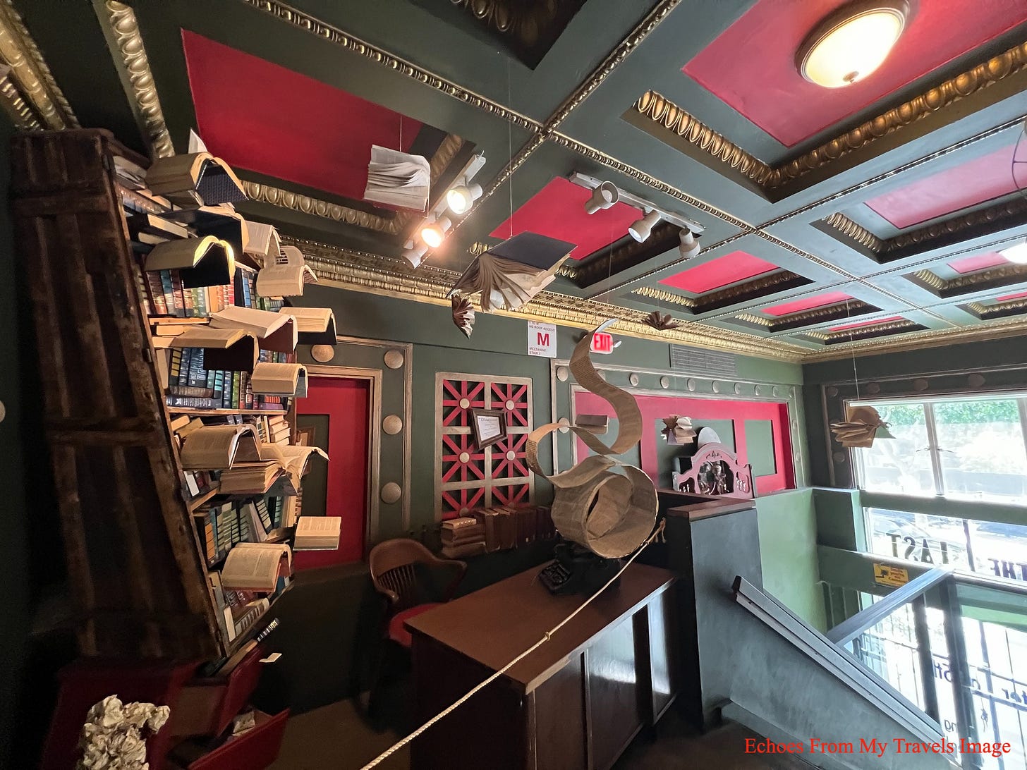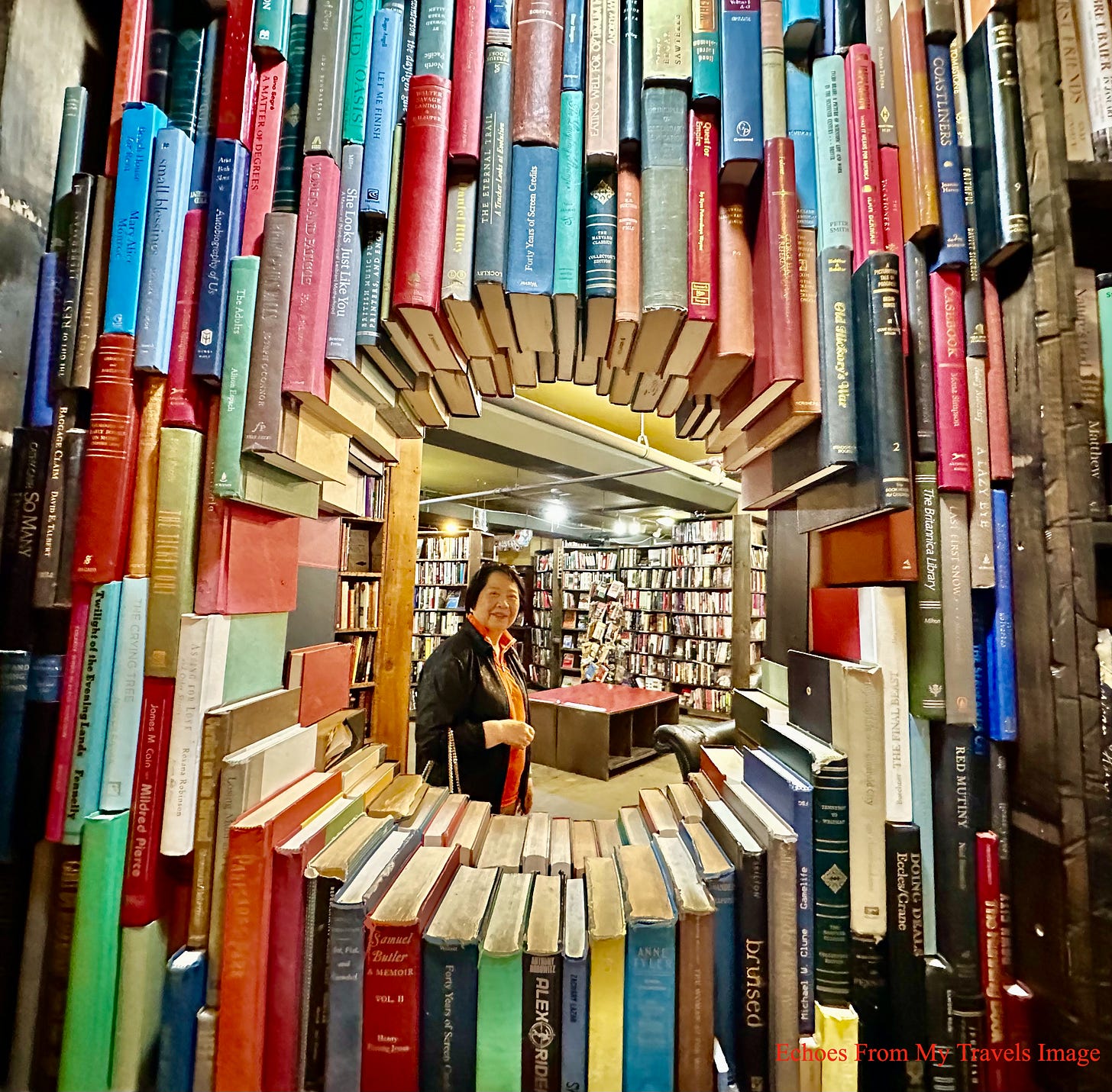 在一偶然機會上,我被「最後書店」驚艷的照片吸引住,前往被稱之文化沙漠的洛杉磯市中心,看到舊銀行如何華麗轉身為書店。進到書店看到10米高眺的大堂,大里石地面,還有角落的舊式大金庫,陳列各類書籍。二樓可以看到利用2000多冊書堆砌出成拱形的「書海時空隧道」,還有「迷宮書架」,以及「書頁飛天」的超現實設計,成爲網紅打卡,和情侶訂下人生盟約之處。