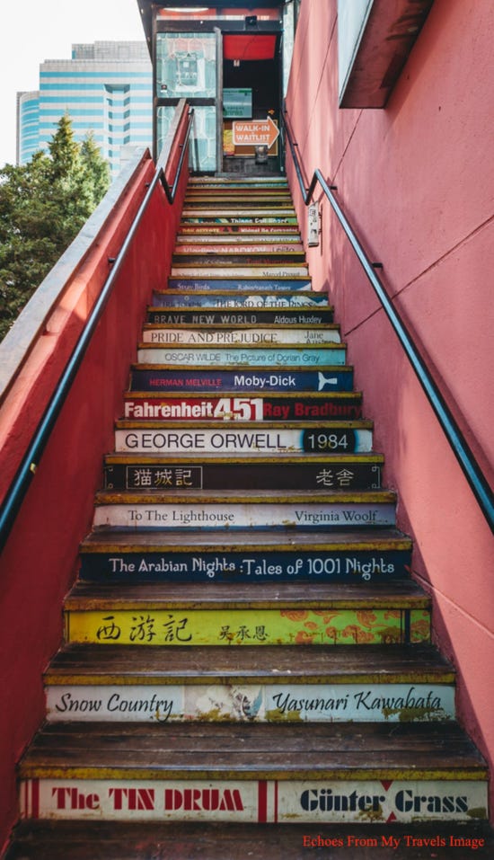 人生有起有落,書店亦復如此,像位於北京三里屯的老書蟲書店,陪我渡過許多在北京落單的日子。年前聽到老書蟲書店關門,不勝噓唏。記得在寒冬,第一次到老書蟲書店,在依著深紅牆壁,看到戶外階梯畫成20幾本書樣,經過這些書樣階梯才到2樓的書店,這些書樣階梯有「西遊記」,「科學怪人」,「傲慢與偏見」等,當時踏上這書樣階梯時,充滿了興奮之情。