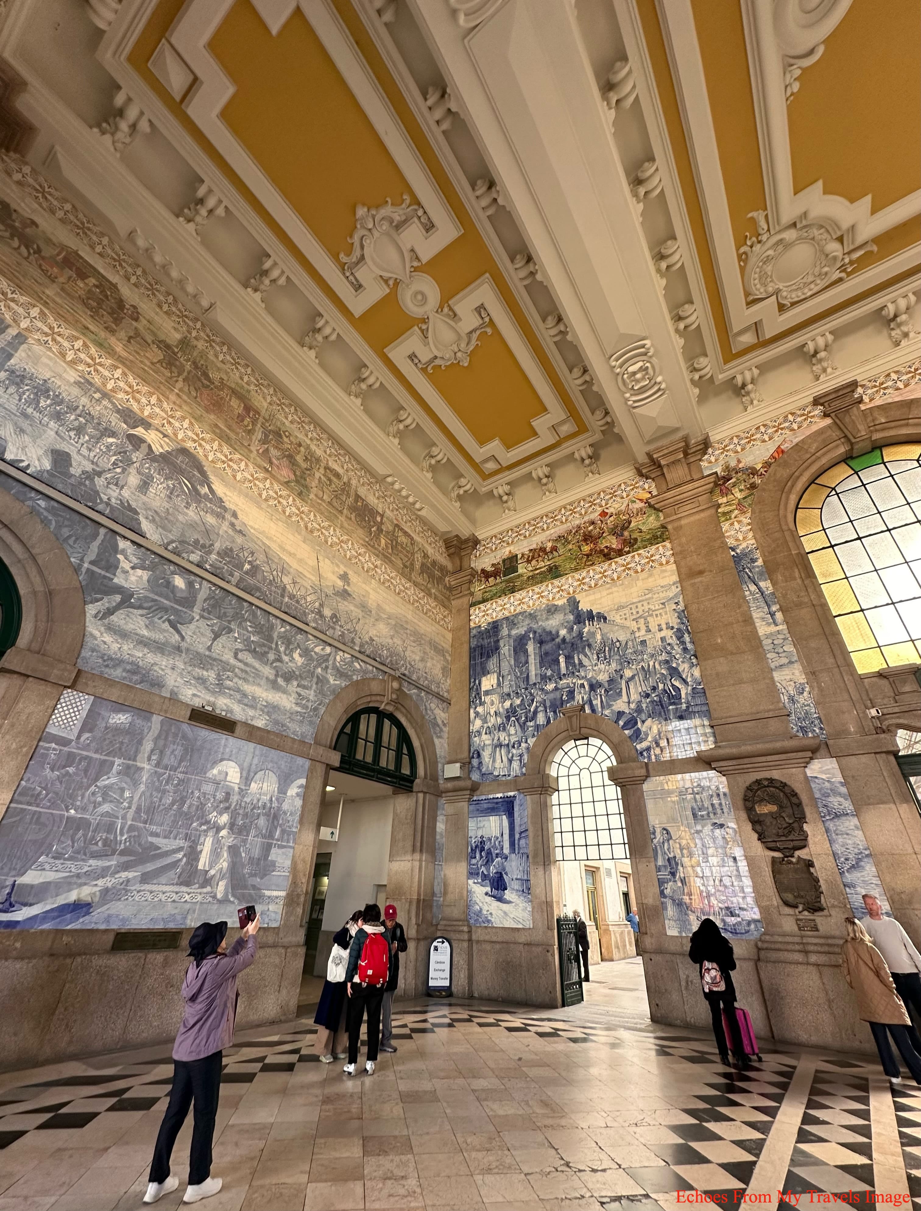 不遠之處的波爾圖聖本篤火車站,是交通樞紐,也是敘述建國史詩的博物館,車站的大廳,巨大的青瓷瓷磚牆,敘述葡萄牙民族的形成,大航海時代的故事,葡西的戰爭和交通的歷史。在這4大篇章的烘托下,聖本篤火車站已成為政治人物朔造形象的舞台。