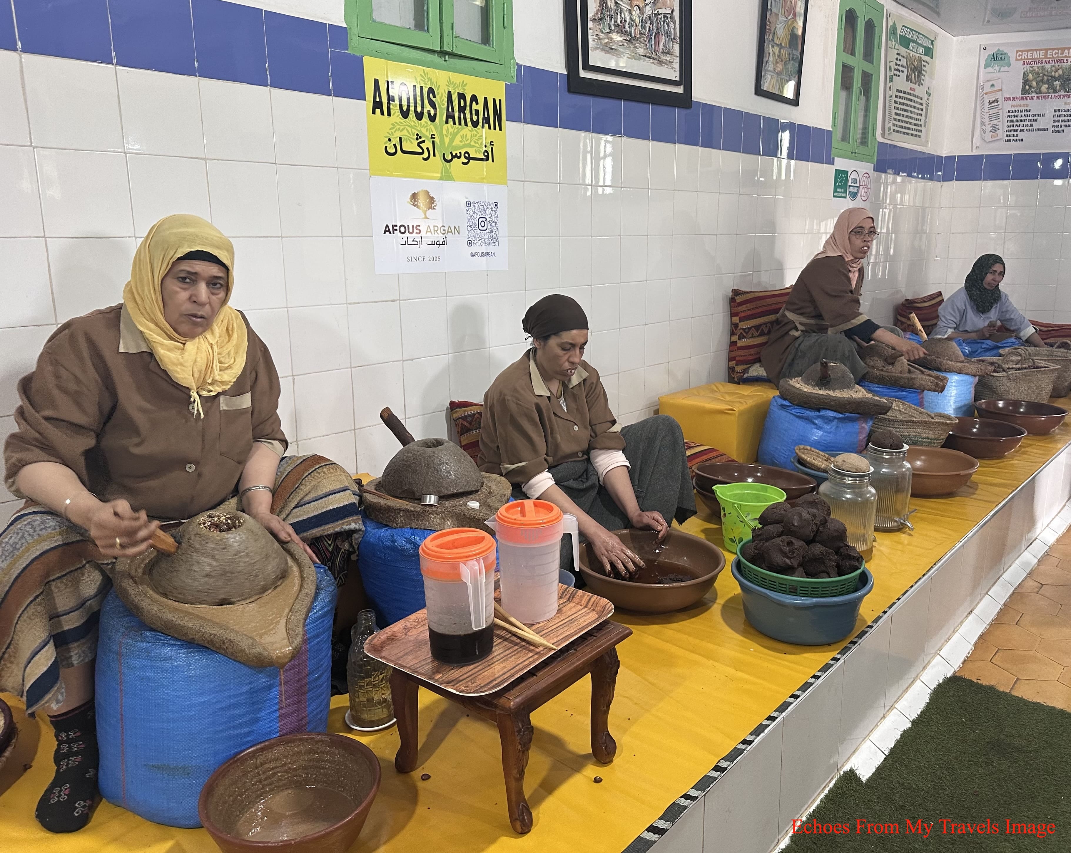 我在埃索維拉(Essaouira) 鄉間,看老太太用傳統工藝在磨製堅果油,她們用槌敲果,取出果仁,然后用磨石磨出油汁,小店的經理讓我們試吃,堅果油加上蜂蜜,顏色像淡巧克力,有芝麻醬的香氣,沾在面包,我連續吃了好幾片,大喊過癮。