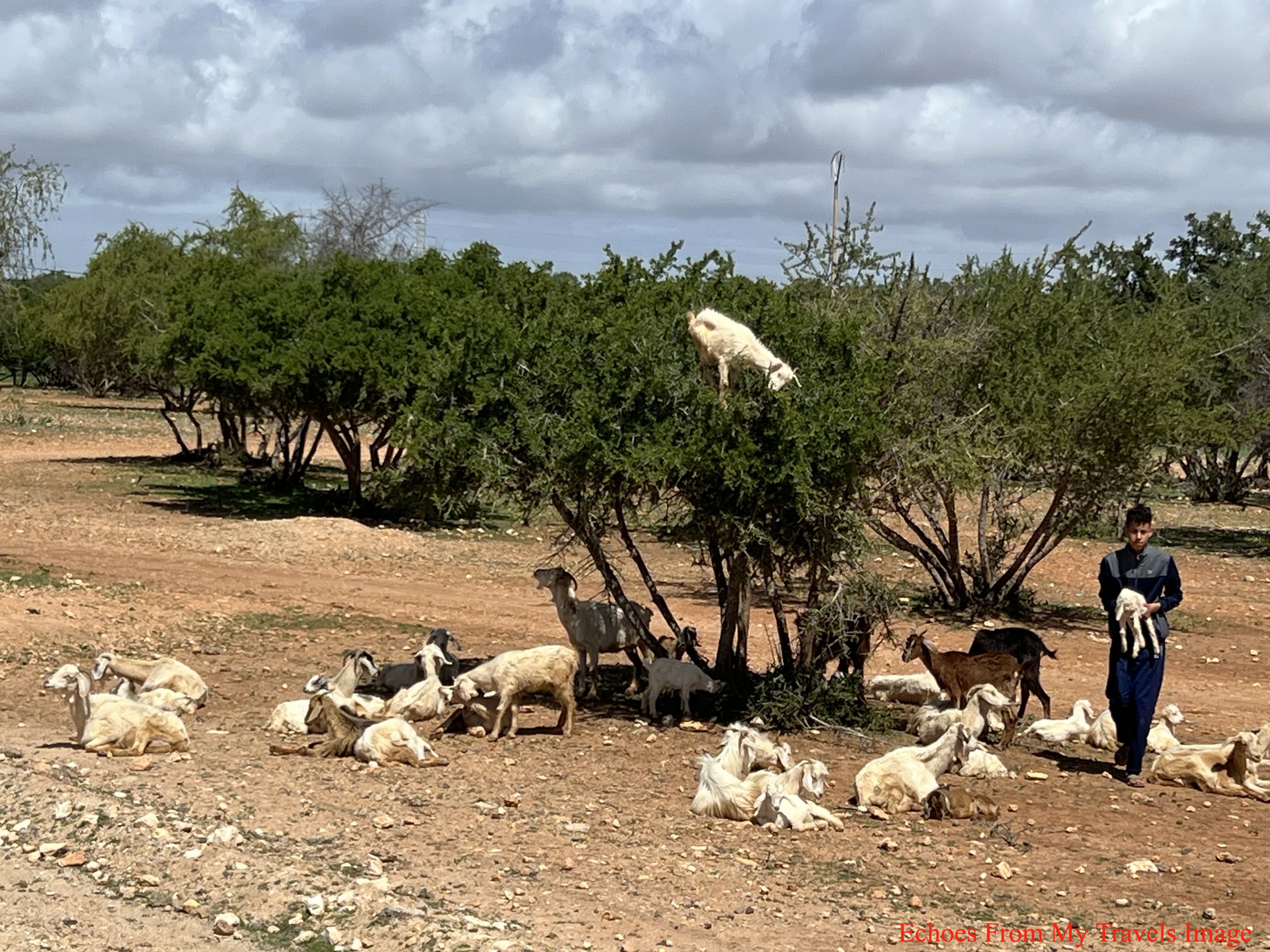 我的思緒又飛往一頭,山羊站在10幾呎高的樹上,是本能爬到樹上覓食堅果還是被牧羊人拴在樹上?摩洛哥西南地區,氣候乾旱,植被稀少,山羊爬樹啃樹,培養出爬樹的本能,Argan樹的堅果,是山羊美食之一,山羊上樹自然成為摩洛哥一景,農民也樂的讓山羊幫他們處理掉堅果的硬殼。相得益彰。
