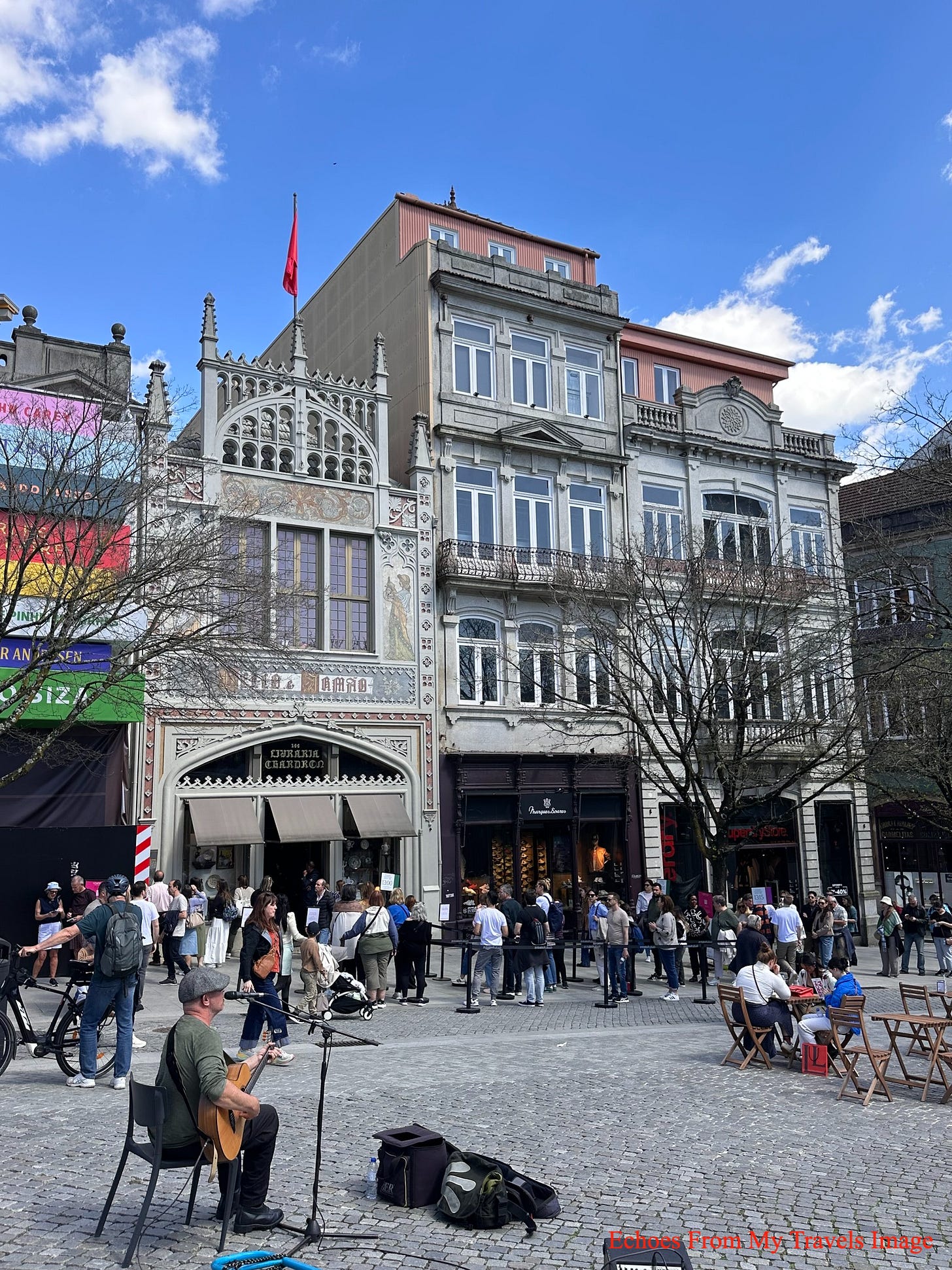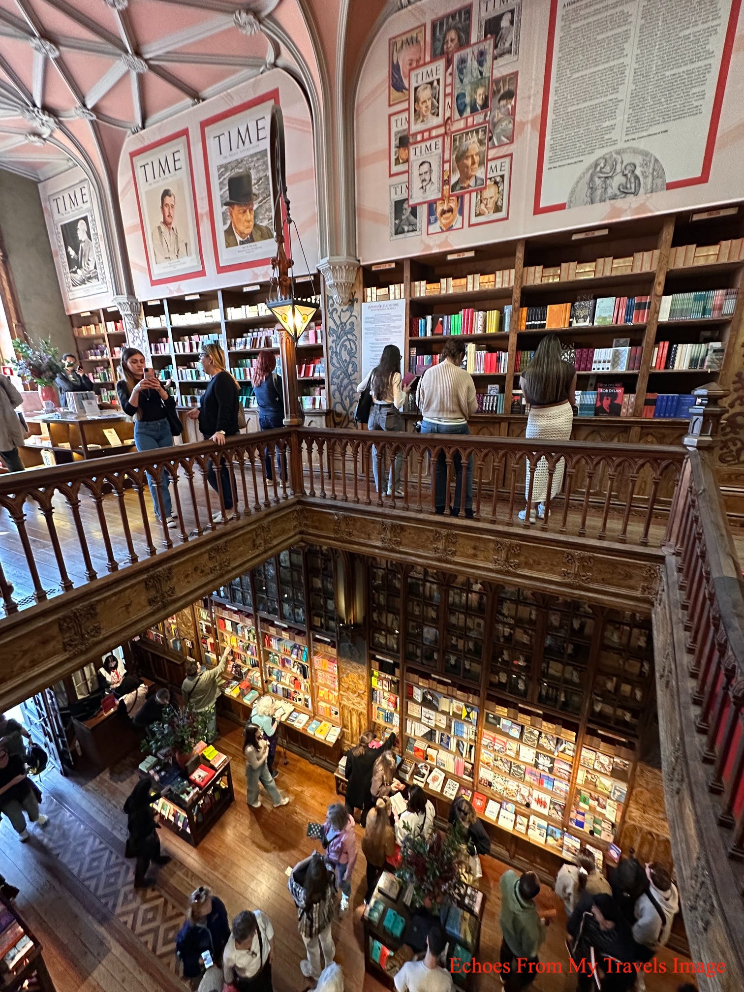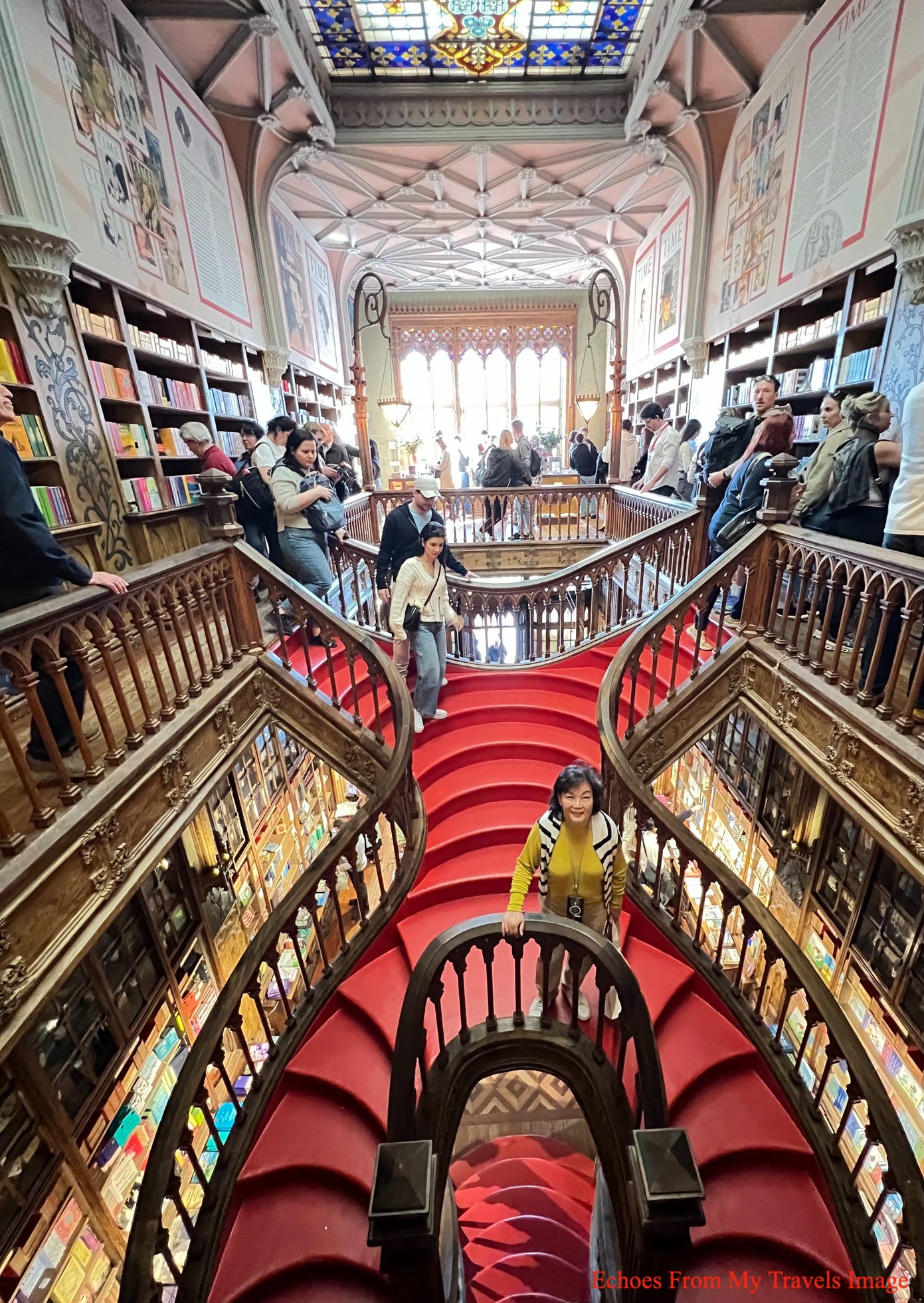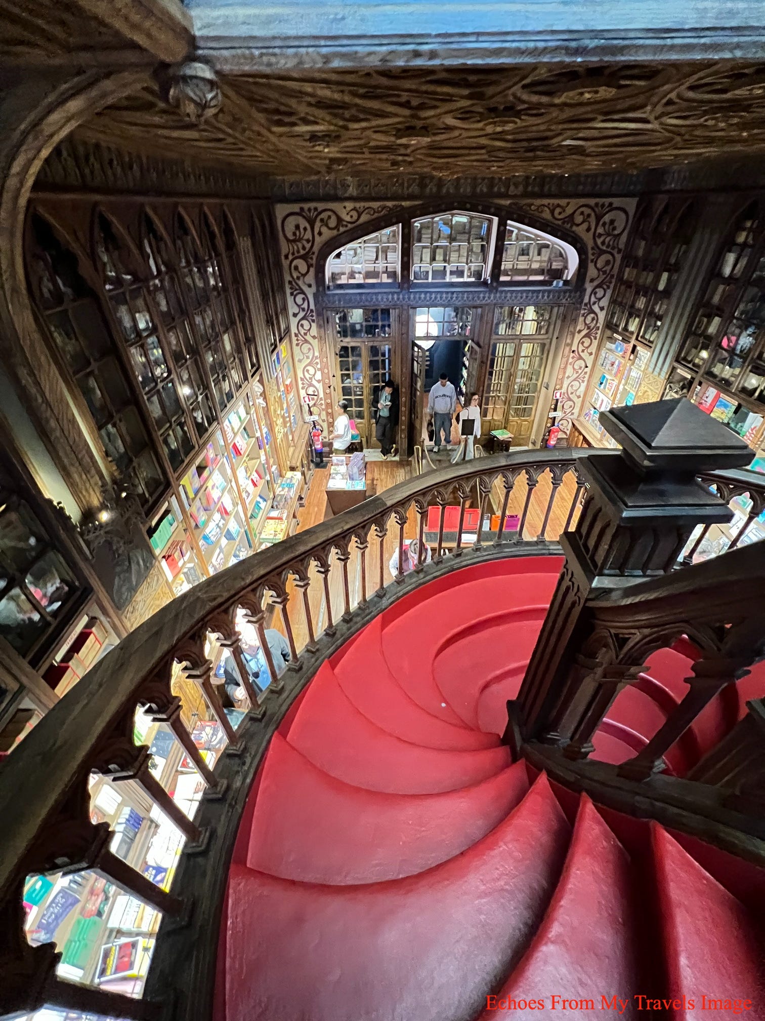 來到萊羅書店,排隊的人群,已有50-60人,門口廣場,還有賣唱的藝人,非常熱鬧,進到了書店就看到深紅的螺旋樓梯位在書店中央,遊客像著迷似被吸引過去,還順著樓梯,一步步走向2樓。螺旋樓梯設計巧思,結構大膽且充滿動態,被形容「看似輕盈但充滿冒險」。